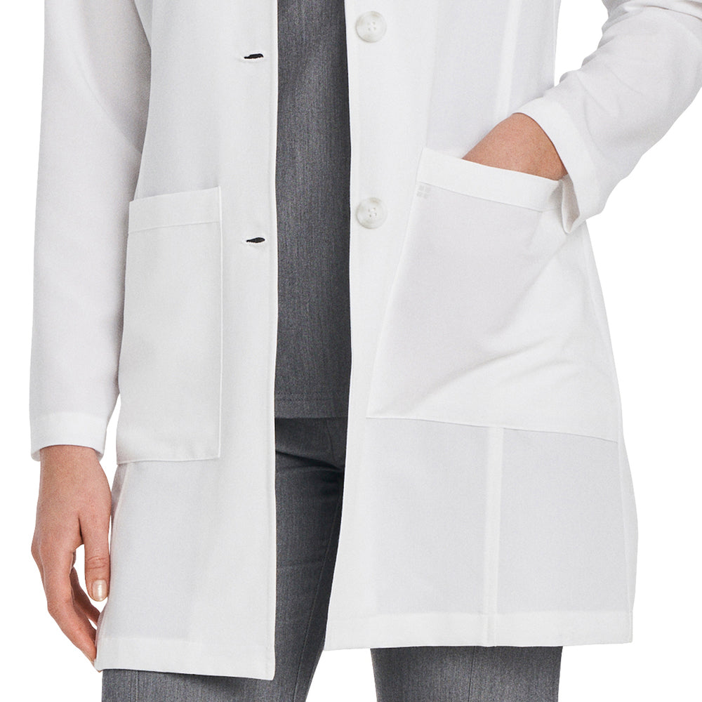 This flattering Contemporary Fit lab coat has a stylish notched collar with a full lapel and a 4 button closure. Features 4 pockets, 2 front pockets with extra depth, 1 internal cell phone pocket, and 1 internal tablet pocket. Front princess seams offer a slimming fit and an added back vent for ease and mobility.