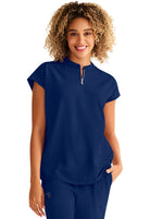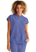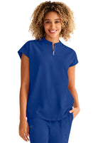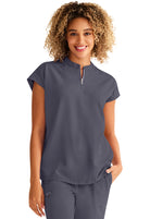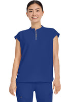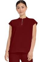 Oversized comfy Mandarin Collar Boxy top features collared neckline with half zip, dolman sleeves, 2 welt pockets, rounded hem & back yoke box pleat detail. Knit trim at front shoulder and back yoke add to this tops charm.