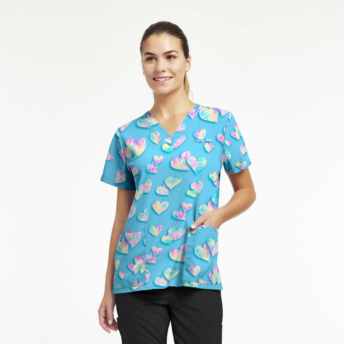 TIE DYE LOVE WHITECROSS PRINTED V-NECK SCRUB TOP