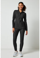 This zip front, mock-neck jacket is form flattering and stylish. It features front zip pockets, multiple active-inspired seams, and power mesh insets at sleeves and racer back panel. Contemporary Fit. Center Back: 26"