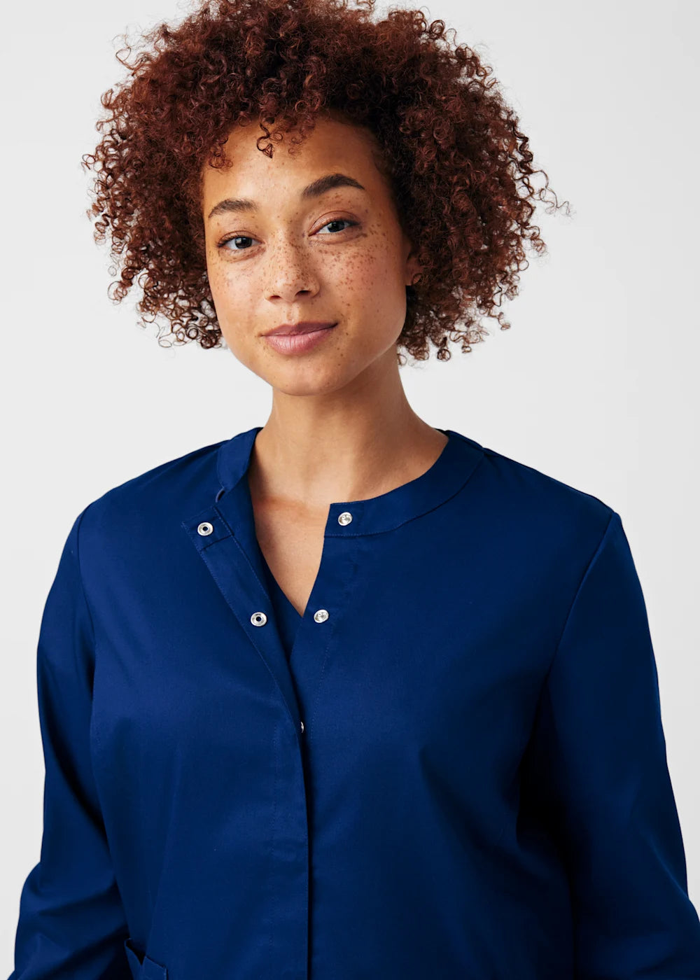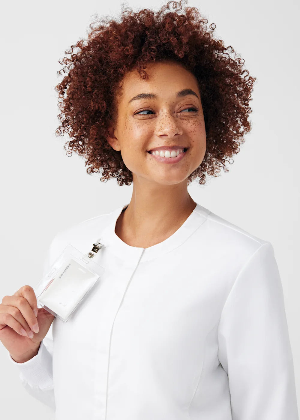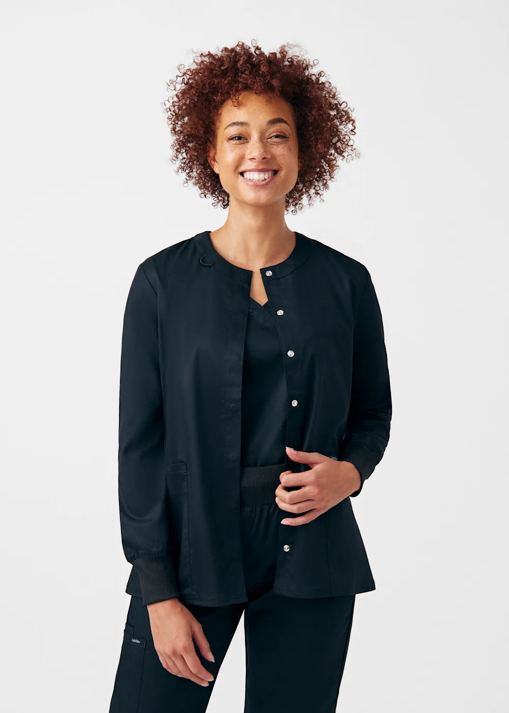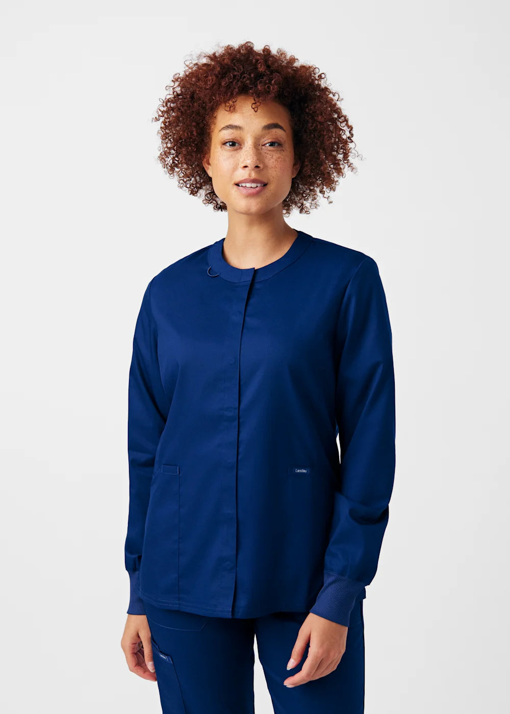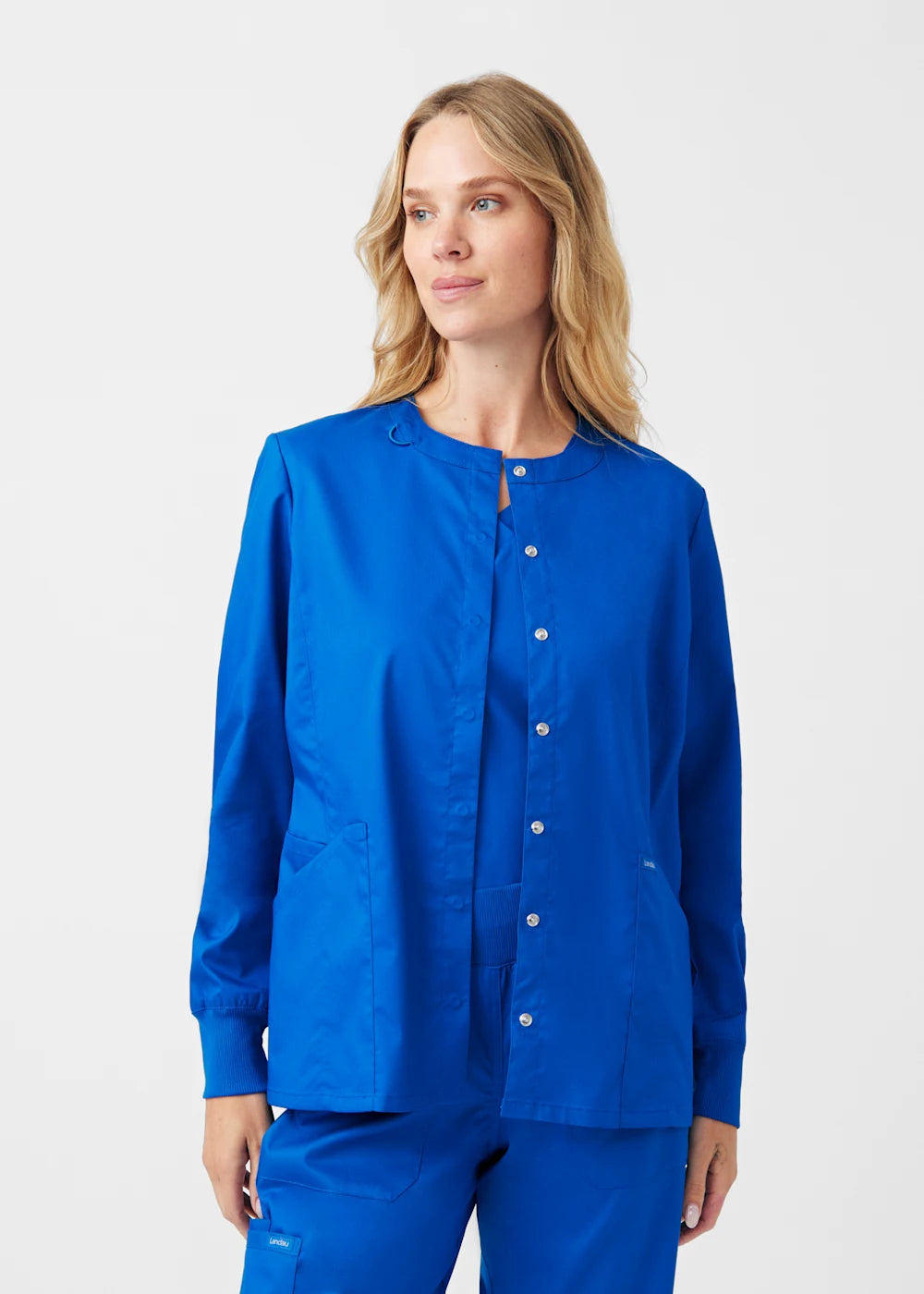 Stay warm and snug at work with our women's jacket. Its hidden snap front ensures a sleek look while keeping you warm. Complete with a round neck featuring a convenient loop for your badge loop, soft and cozy knit cuffs, and flattering princess seams for a feminine silhouette. This jacket boasts three front pockets, including two pen slots, and a hidden utility loop to keep your essentials organized and within reach.