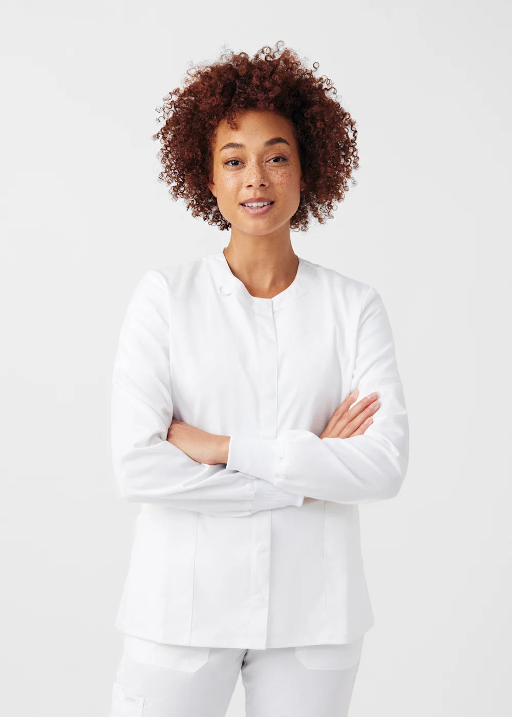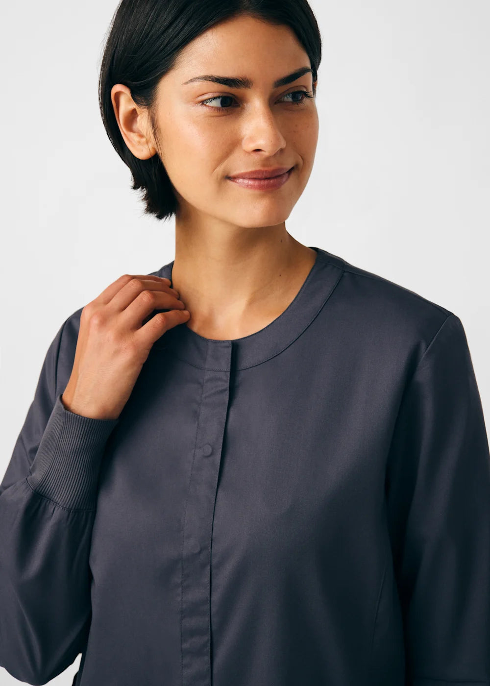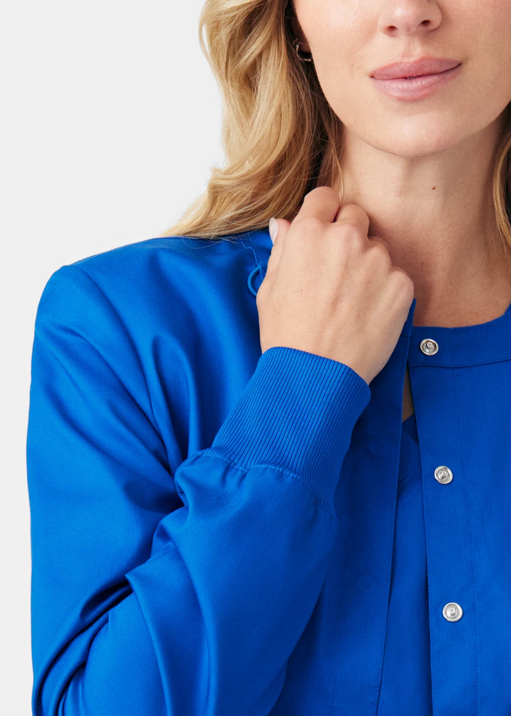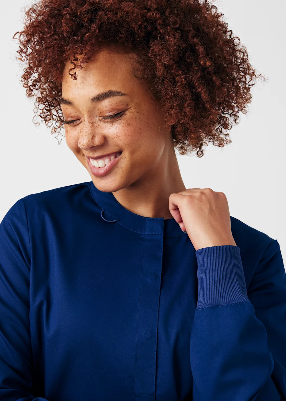 Stay warm and snug at work with our women's jacket. Its hidden snap front ensures a sleek look while keeping you warm. Complete with a round neck featuring a convenient loop for your badge loop, soft and cozy knit cuffs, and flattering princess seams for a feminine silhouette. This jacket boasts three front pockets, including two pen slots, and a hidden utility loop to keep your essentials organized and within reach.