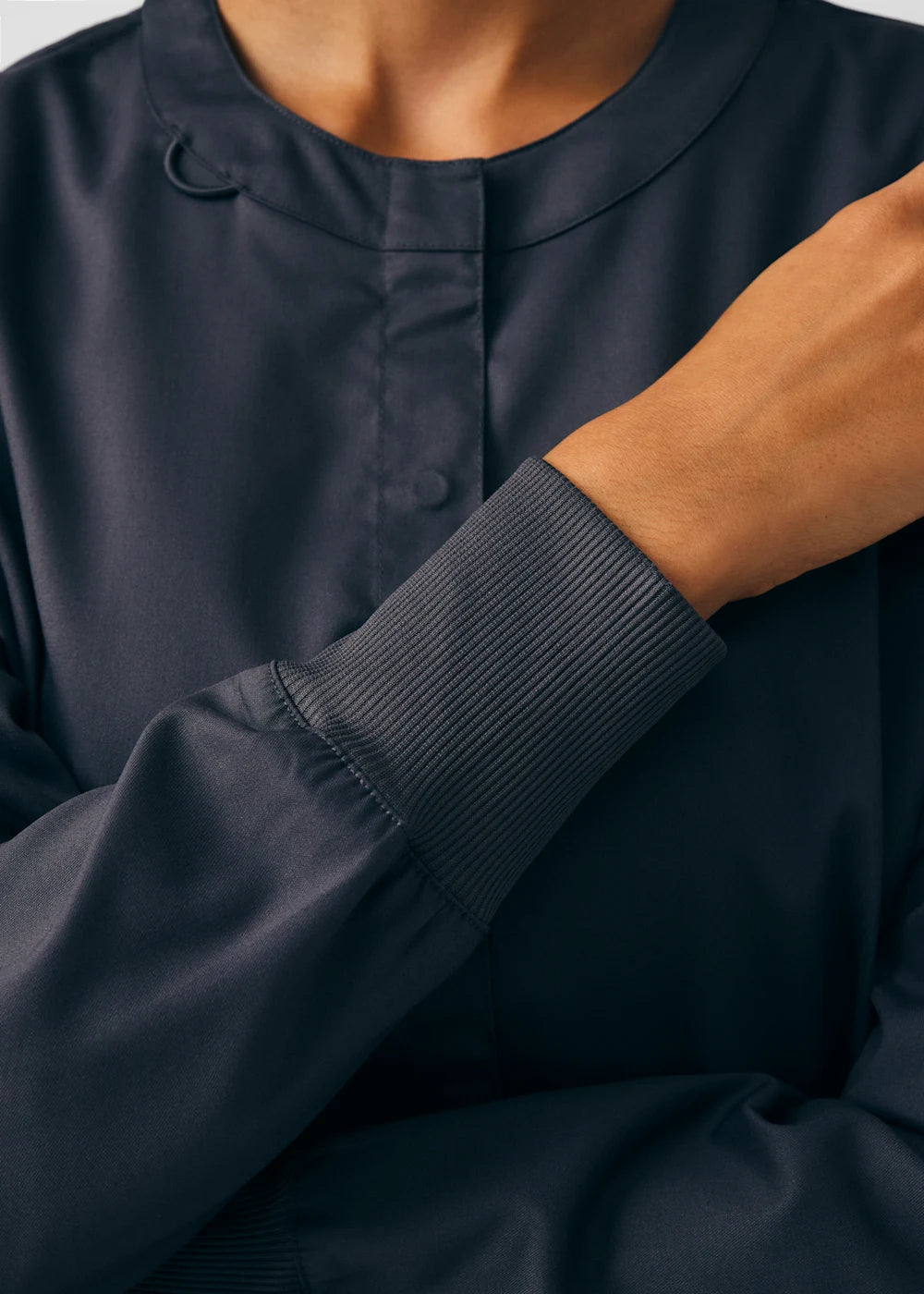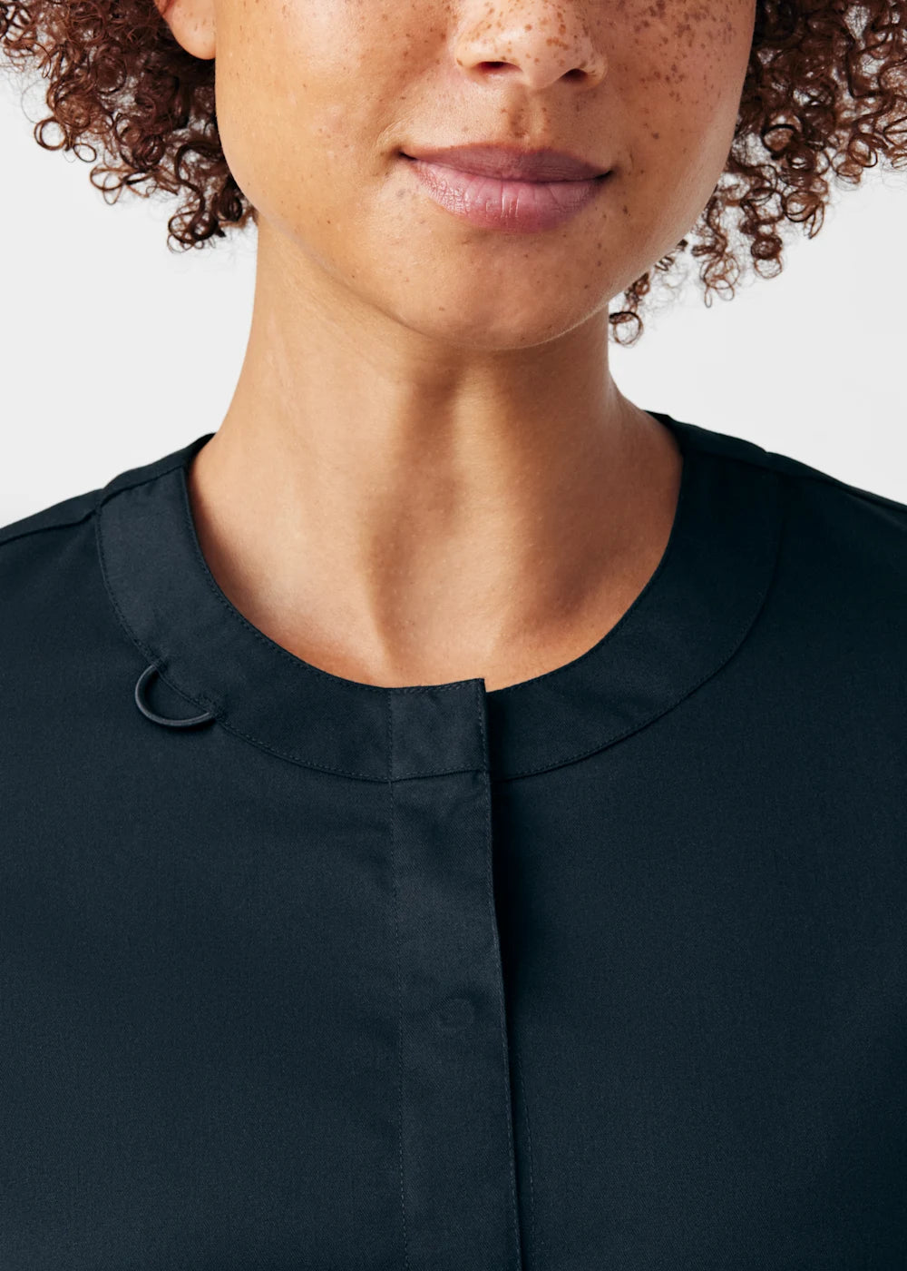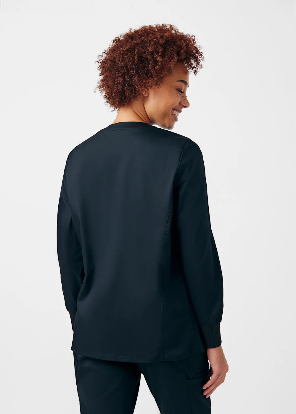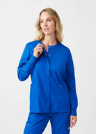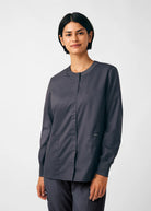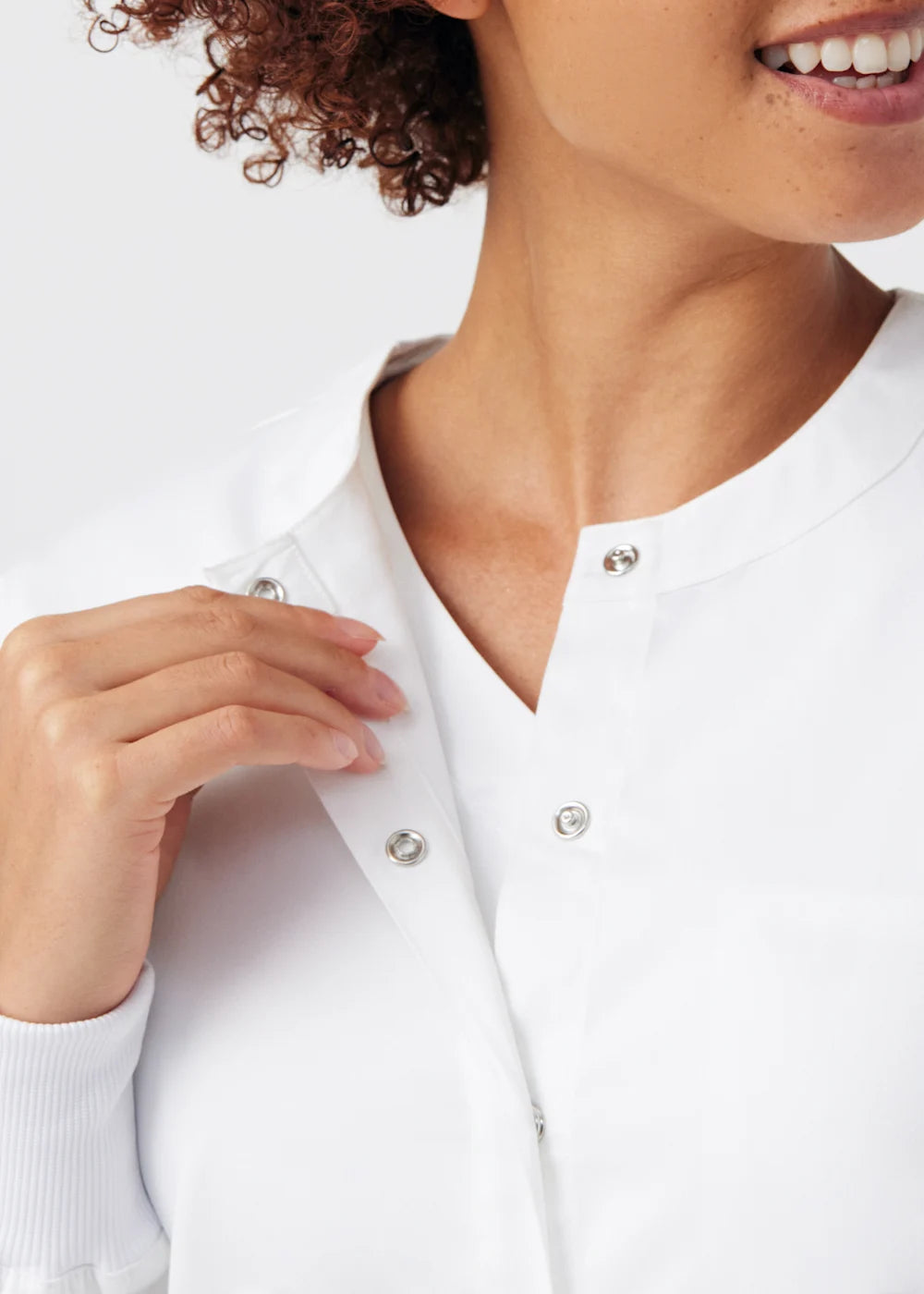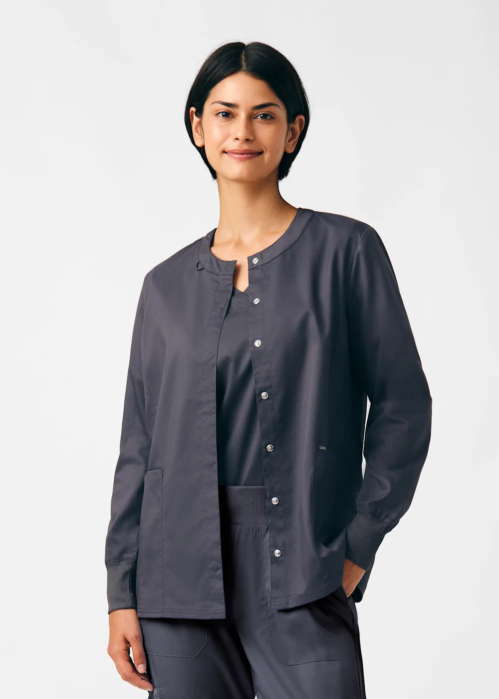 Stay warm and snug at work with our women's jacket. Its hidden snap front ensures a sleek look while keeping you warm. Complete with a round neck featuring a convenient loop for your badge loop, soft and cozy knit cuffs, and flattering princess seams for a feminine silhouette. This jacket boasts three front pockets, including two pen slots, and a hidden utility loop to keep your essentials organized and within reach.