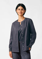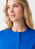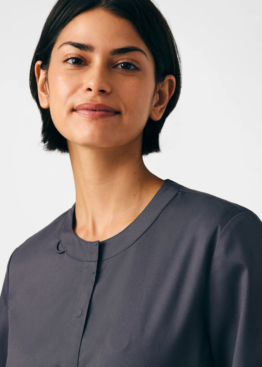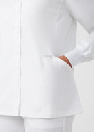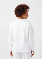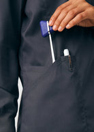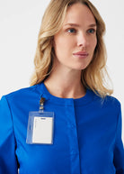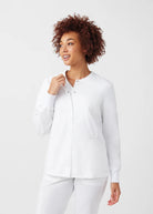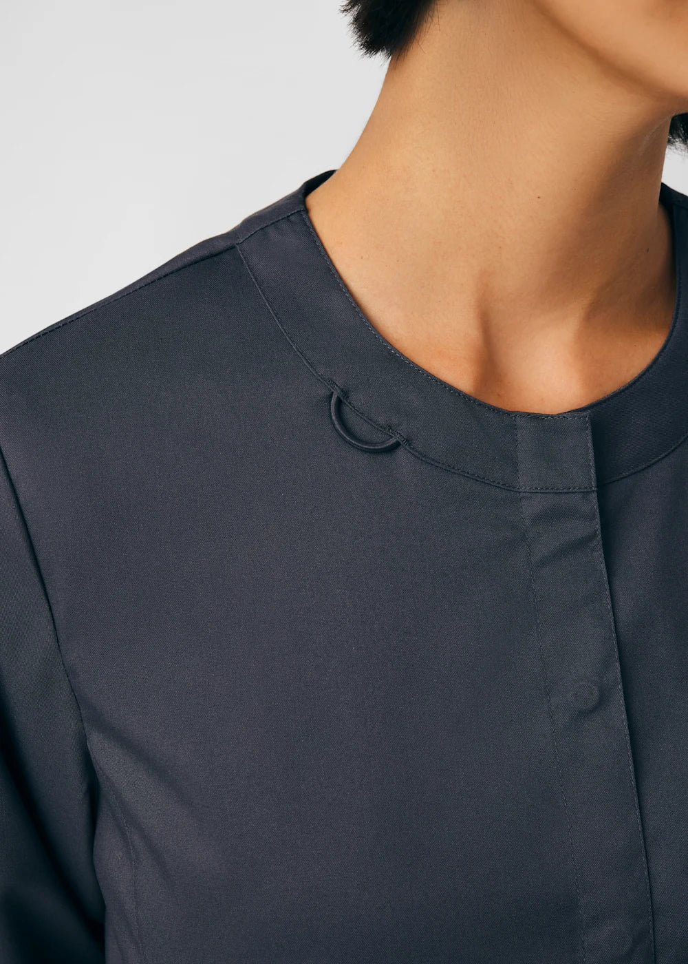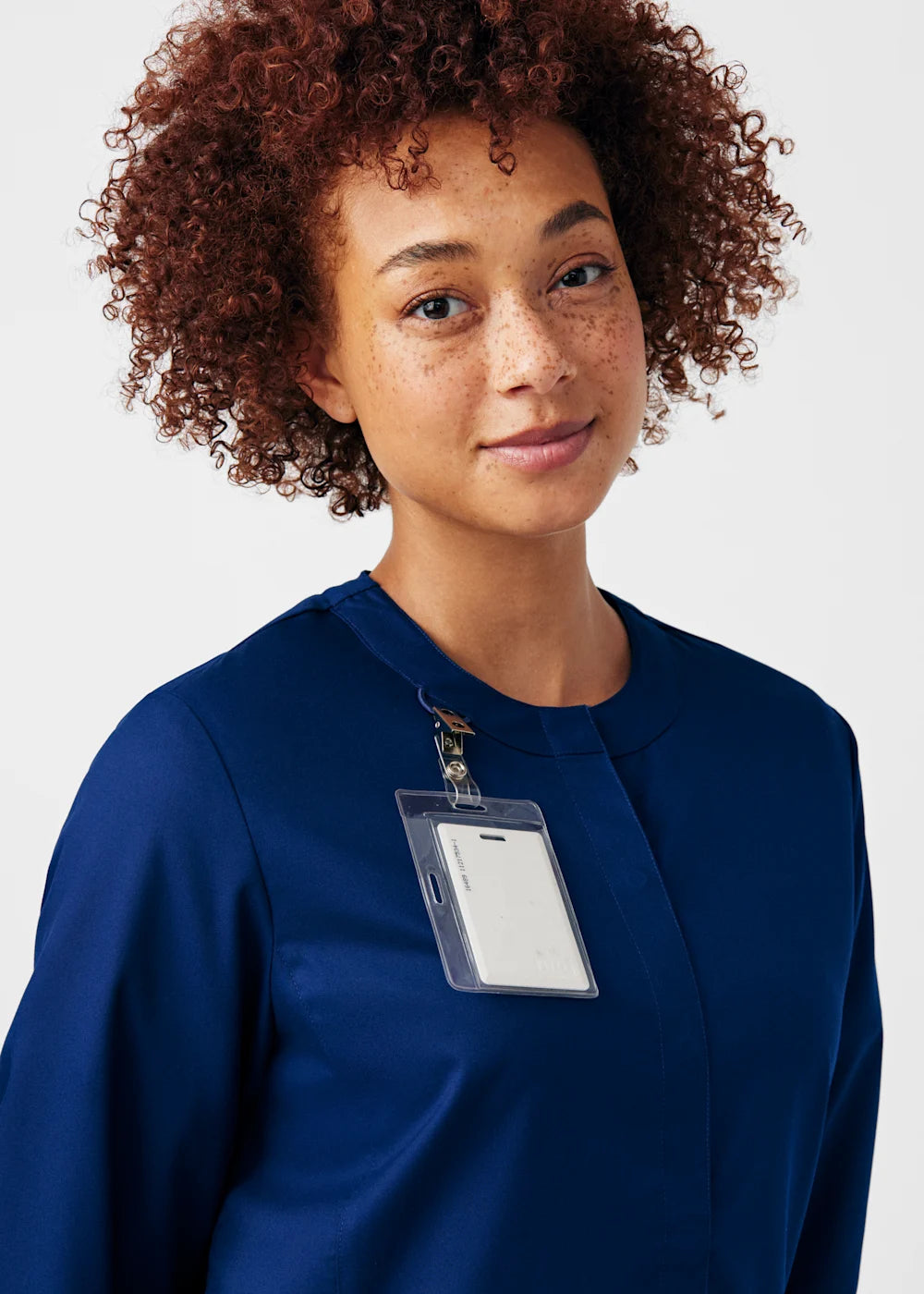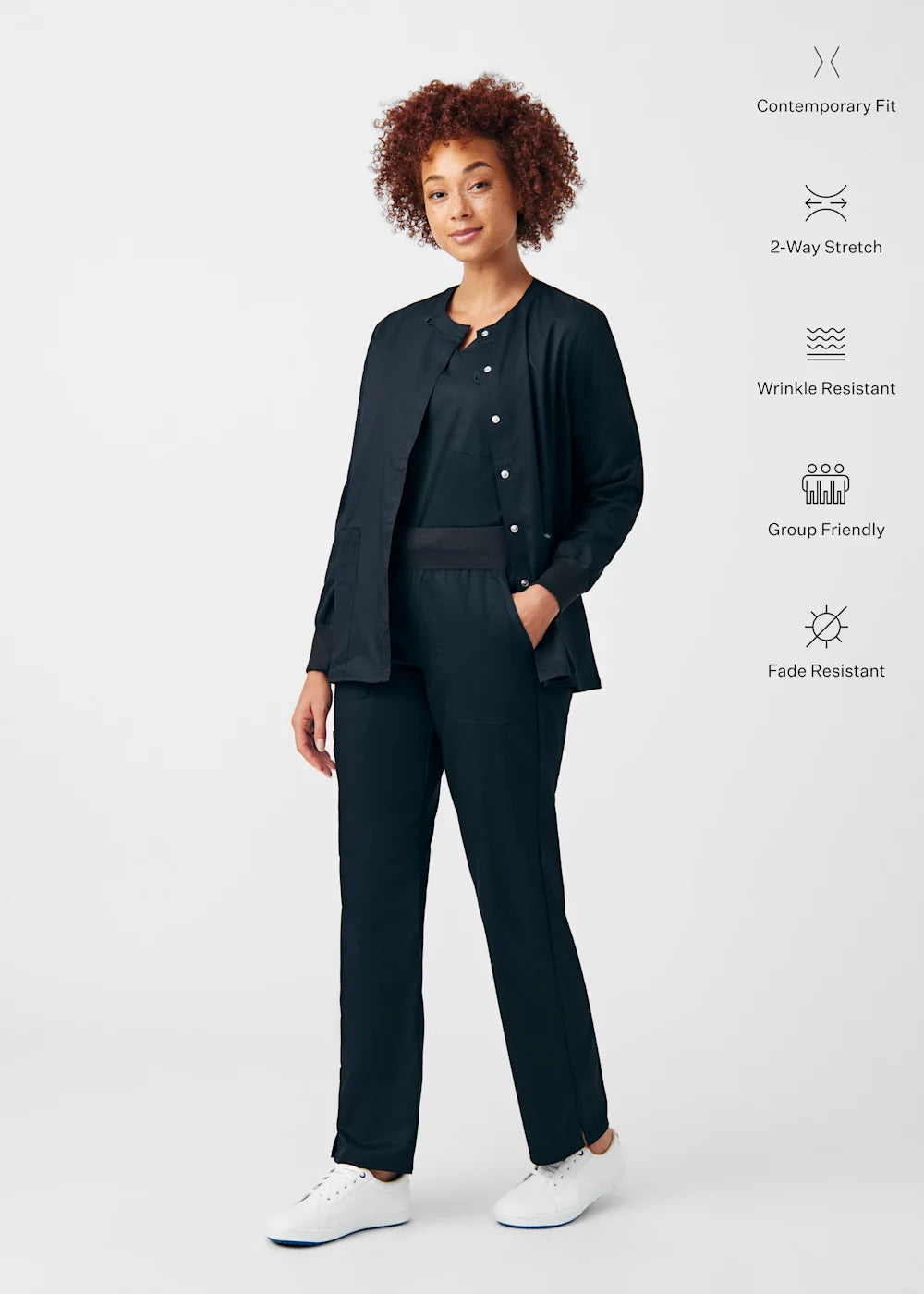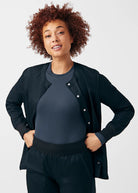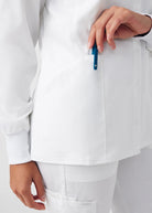 Stay warm and snug at work with our women's jacket. Its hidden snap front ensures a sleek look while keeping you warm. Complete with a round neck featuring a convenient loop for your badge loop, soft and cozy knit cuffs, and flattering princess seams for a feminine silhouette. This jacket boasts three front pockets, including two pen slots, and a hidden utility loop to keep your essentials organized and within reach.