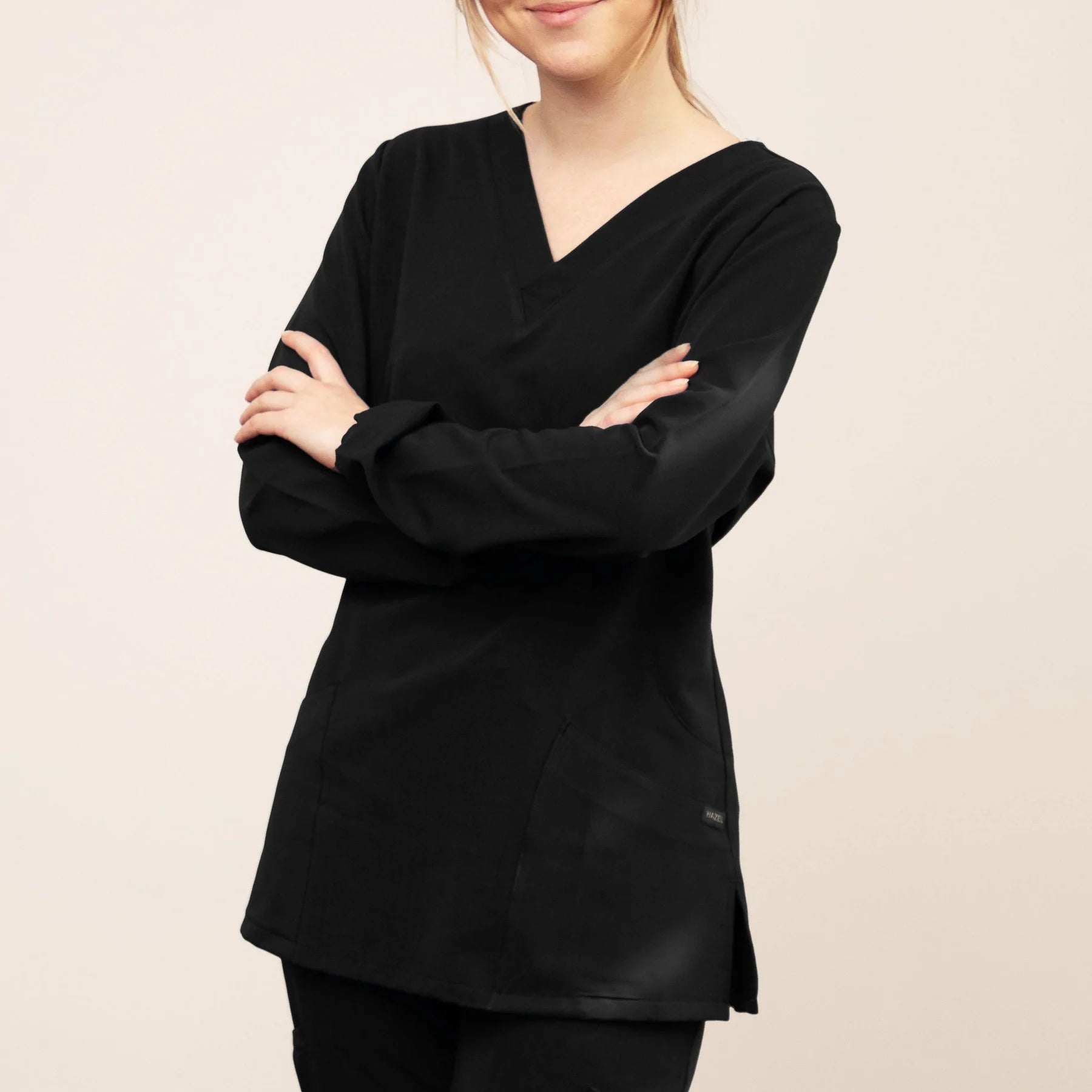 Our tops are not only long-sleeved, but they are unique in that they are longer in torso length than typical scrubs on the market, providing flexibility, coverage, and room for a full range of motion without the risk of an exposed back/midriff while reaching up/bending down.