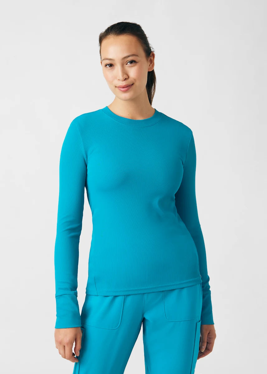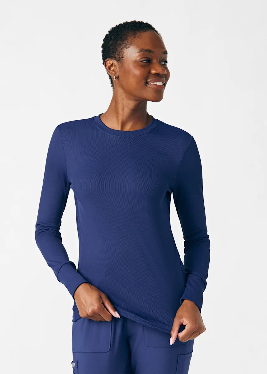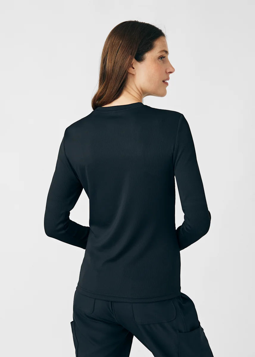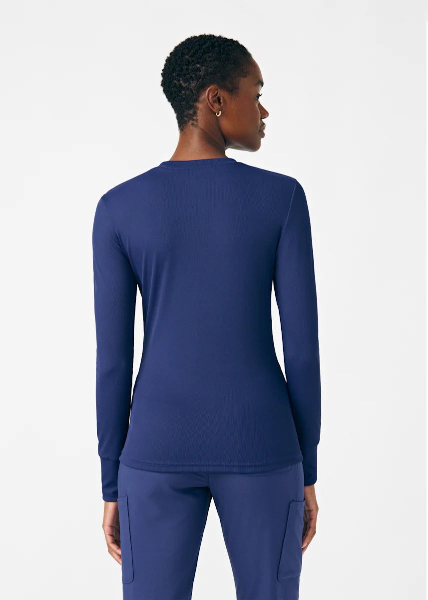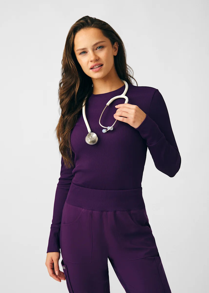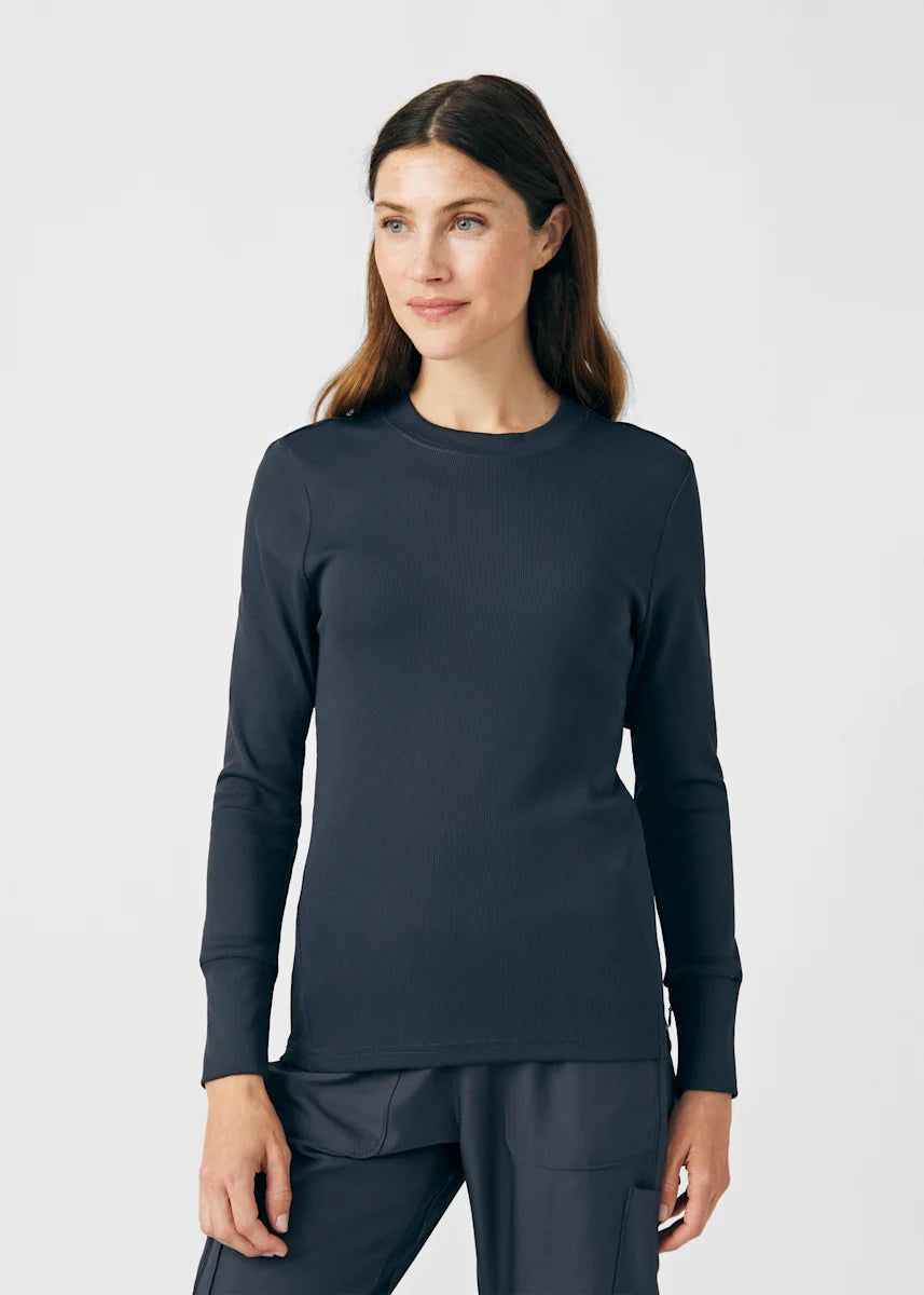 This contemporary layering underscrub tee is made with figure flattering rib knit with wrap-around side seams and a zipper pocket at the left cuff to keep your personal essentials safe. This long-sleeve tee is the perfect way to add warmth to your wardrobe when you're working in cold environments.